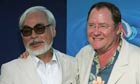 Ponyo, along with most Studio Ghibli productions, is distributed worldwide by the Walt Disney Company. Miyazaki's (left) old-style, hand-drawn animation techniques contrast nicely with the computer-generated oeuvre of Disney chief creative officer and Pixar whiz John Lasseter (right) Photograph: David Livingston/Getty Images North America