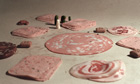 In The Sausage Photographs, the artists wilfully ignored the exhortation made by parents to their children: "Don't play with your food". In one of the 10 pictures, called At the Carpet Shop, a family of gherkins inspects piles of carpets and rugs made out of cooked meat, helped by a tip of white radish that can only be the sales assistant. One of the gherkins seems to be bending over to inspect one particular slice of processed meat while a smaller gherkin, presumably a child, stands by, apparently bored. A single round slice of mortadella, broad and fat-flecked, sits richly in the centre of the shop; dog-biscuit cushions are scattered throughout.
