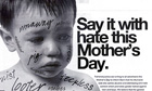 Fathers4Justice ran a national press ad in March this year with the headline "Say it with hate this Mother's Day", alongside a picture of a toddler with various negative words written all over his body including pig, rioter, wife beater and rapist.