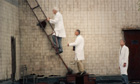 These two film installations are displayed in large, partially enclosed rooms-within-rooms with translucent walls, with mirrors at right angles to the screens. They feel as much like diagrams as real spaces. The light leaks in and the images thrown on the screen are reflected and multiplied by the mirrors. Get up close and you see yourself there, too, your repeated image bending away into infinity. The effect is like watching the bright windows of a train passing in the night. This sense of duplication and reflection is integral to the artists' work. It feels like metaphor – and it feels like a trap.