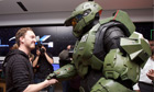 Halo 4’s Master Chief congratulates Peter Gagnon of Seattle on being the first person to purcase the Xbox 360 game. Photograph: Stephen Brashear/Invision for Xbox Photograph: Stephen Brashear/Invision for Xbox