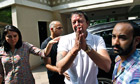 The Bollywood actor Sanjay Dutt, centre, after he broke down during a press conference, with his sister Priya Dutt, left. Photograph: Rafiq Maqbool/AP Photograph: Rafiq Maqbool/AP