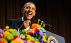 Some of Obama's jokes came at his Republican rivals' expense. He asked that the Republican's minority outreach begin with him as a "trial run" and said he'd take his recent charm offensive with Republicans on the road, including to a book-burning event with Michele Bachmann.