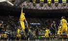 Head coach Kim Mulkey, left, is lifted off her feet by Baylor's star center Brittney Griner. Photograph: Tony Gutierrez/AP Photograph: Tony Gutierrez/AP