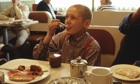 Thomas Turgoose (Shaun) eats breakfast on the set.